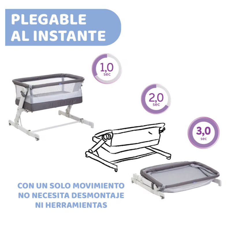 Chicco Next2me Pop Up es la cuna de colecho de Chicco con un sistema de plegado instantáneo que permite plegarla y montarla en tan solo 3 segundos. Una vez plegada, es muy compacta para guardarla y llevarla a cualquier parte. Se puede utilizar como cuna de colecho (con el lateral abatido y fijada a la cama) o bien como cuna estándar. Incluye un sistema sencillo y seguro para fijar la mini cuna a la mayoría de las camas, incluso con canapé o cajoneras. Es regulable hasta en 6 alturas diferentes y reclinable en 2 posiciones para facilitar la digestión o en caso de resfriado del bebé. Incluye un colchón transpirable que facilita la ventilación. Realizada en tejido de malla en red para favorecer el flujo de aire y facilitar la visión del bebé a los padres.Con dos ruedas para desplazarla con más facilidad. Las fundas se pueden extraer completamente para lavarlas.