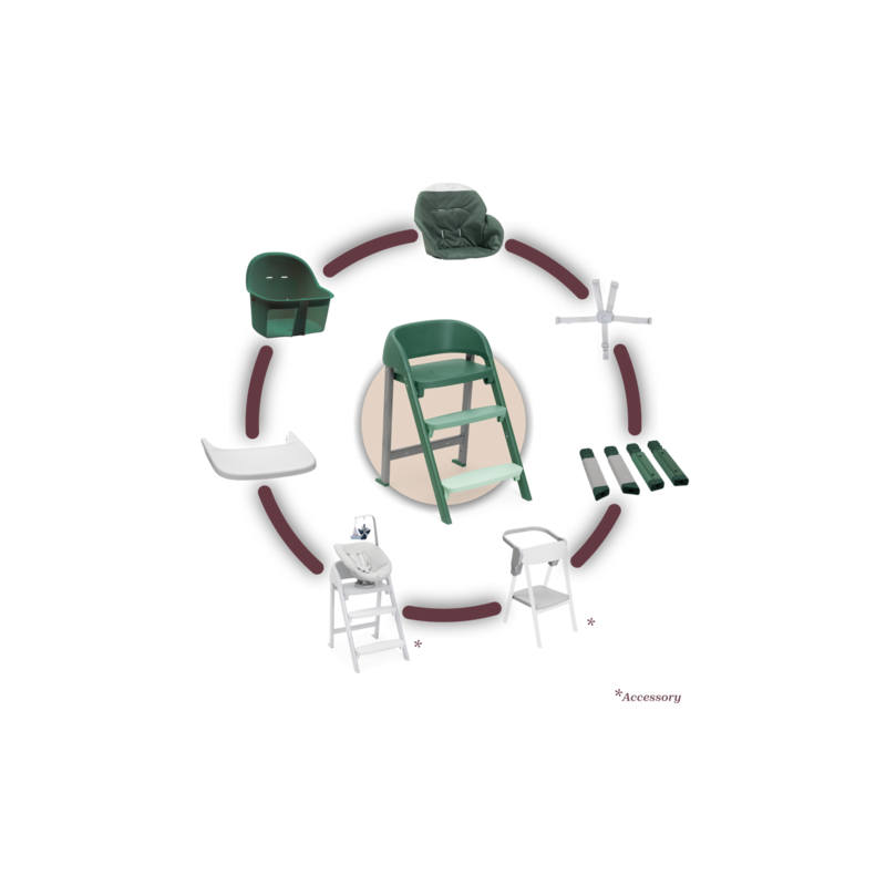 Crescendo Up es muy completa, incluye un cómodo asiento con suave tejido acolchado realizado en poliéster 100% reciclado, con arneses incluidos y una práctica bandeja muy útil cuando la mesa está llena y se necesita espacio o para comidas rápidas. Está equipada también con unas patas adicionales para utilizarse en mesas altas, como las islas de cocina.