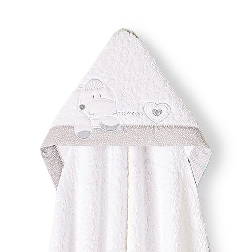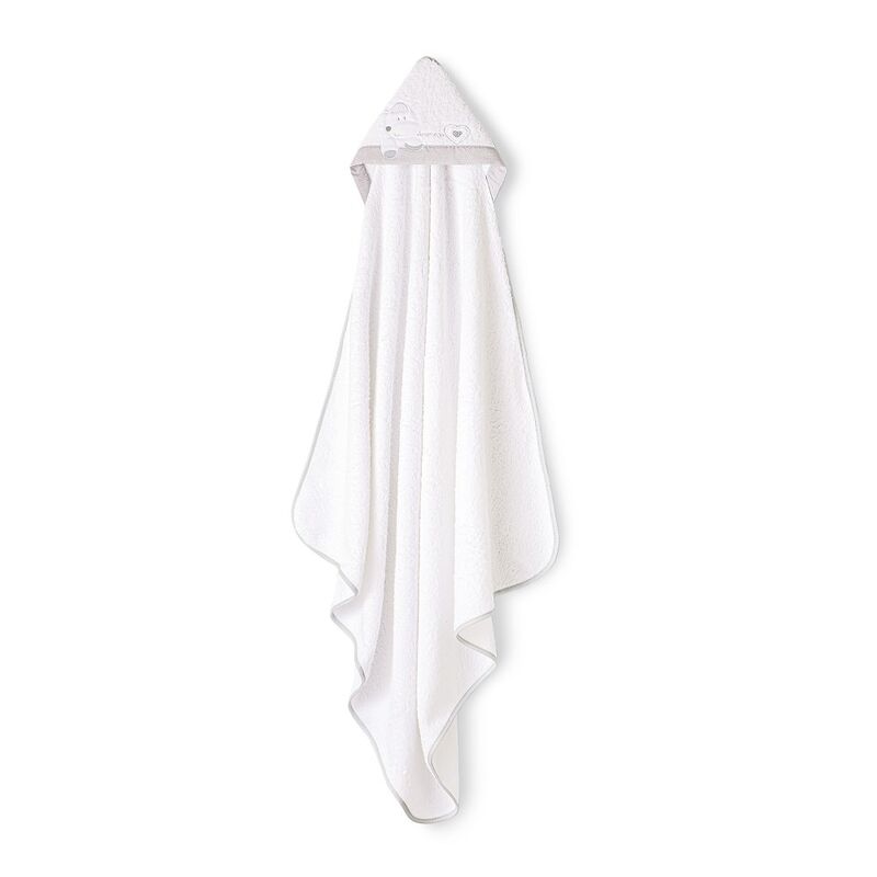 La capa de baño Corazón Amoroso Bco/Gris, una capa de rizo fabricada 100% en algodón , esto garantiza la suavidad necesaria para el secado de la delicada piel de tu bebé.