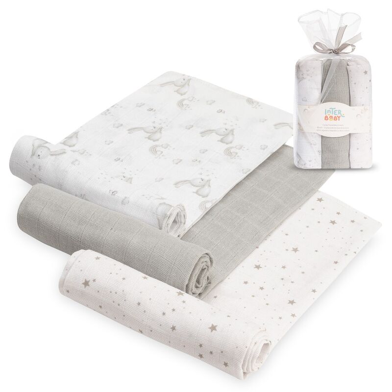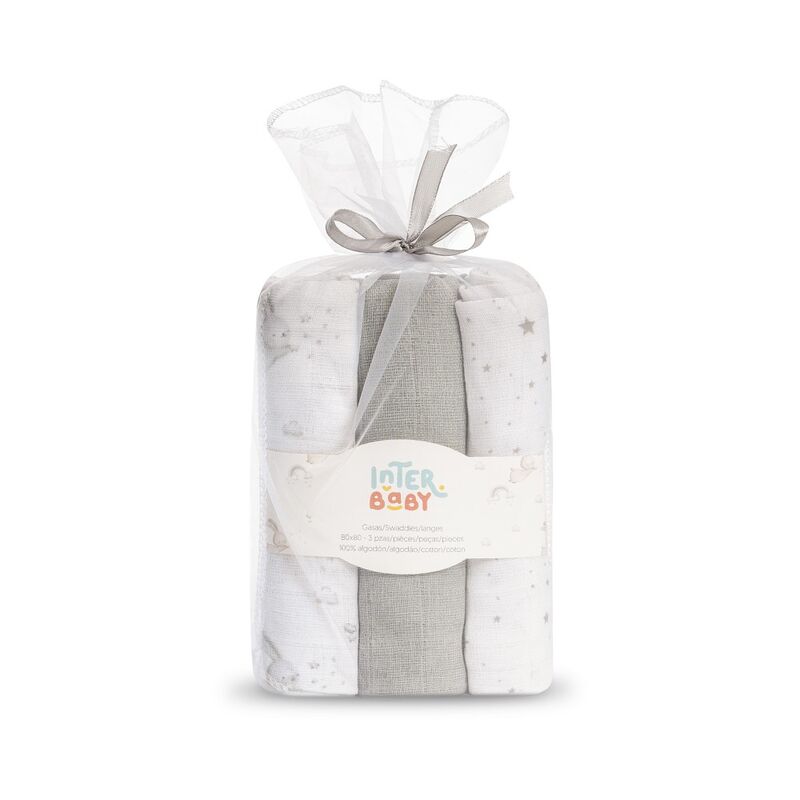 Pack de tres gasas de la colección Conejitos Estrellas de Interbaby, con estampados variados y diseño encantador.