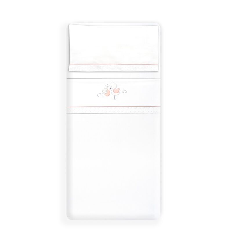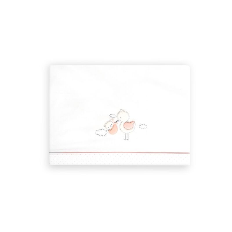 El bordado es una auténtica monada: una cigüeña volando con una bolsita en el pico, donde asoma un osito dormido, acompañado de un pajarito. Los detalles en gris combinan genial con cualquier decoración, aportando un aire sereno y neutro que nunca pasa de moda.