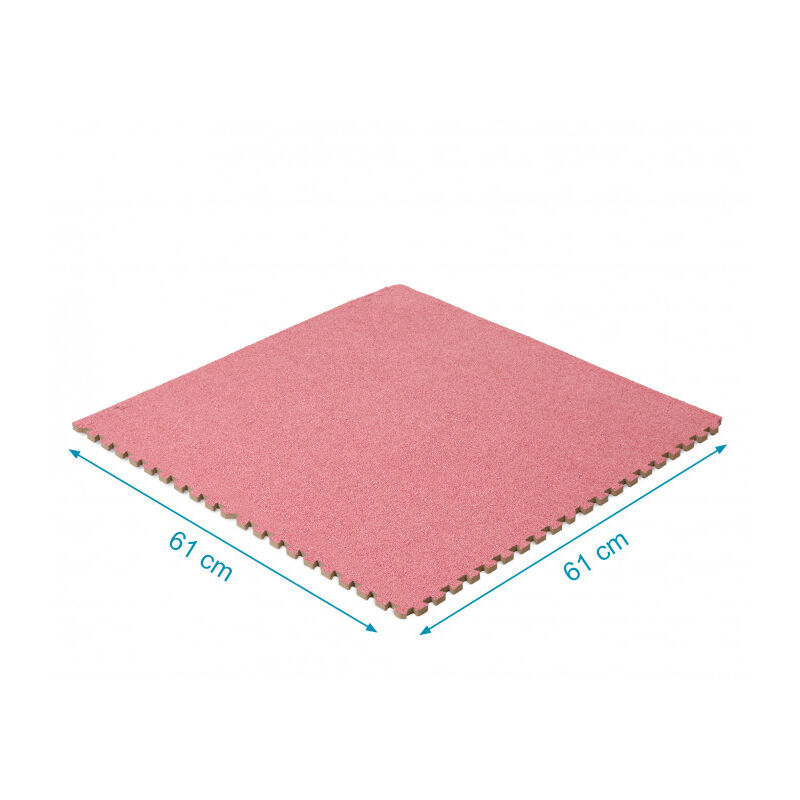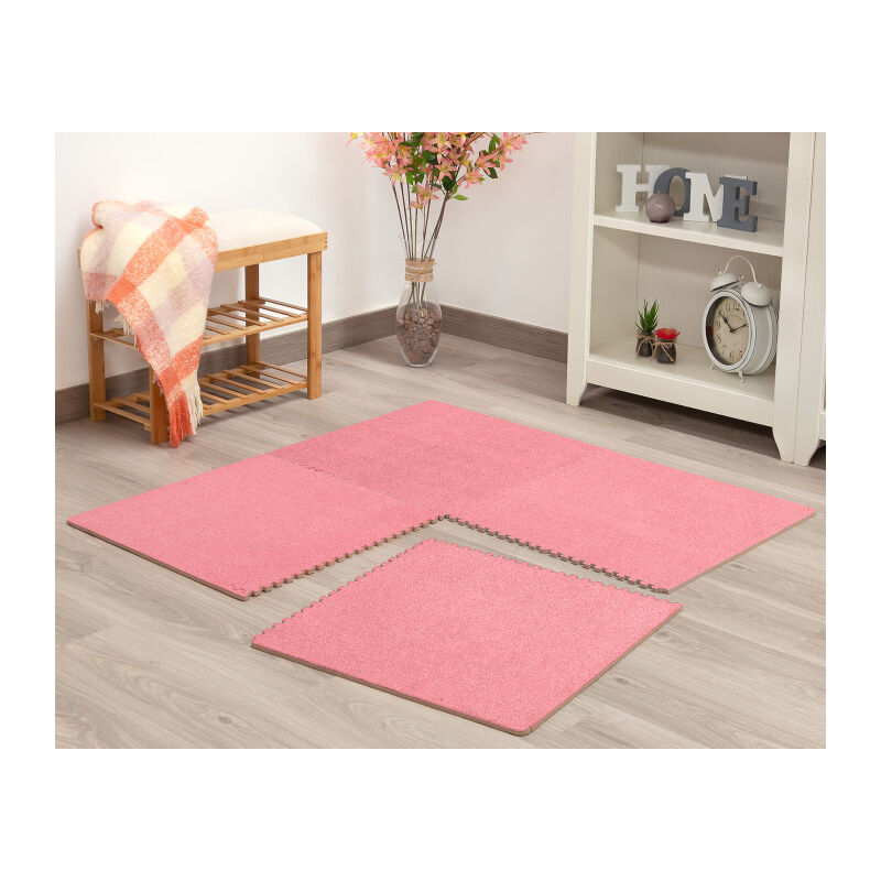 Cuenta con 4 piezas de 60x60cm que se pueden encajar entre ellas de diversas formas gracias a sus dientes. Además también incluye unas piezas laterales para que dichos dientes no queden visibles y que la fusión de la alfombra con el entorno de la casa sea lo más fluida posible.