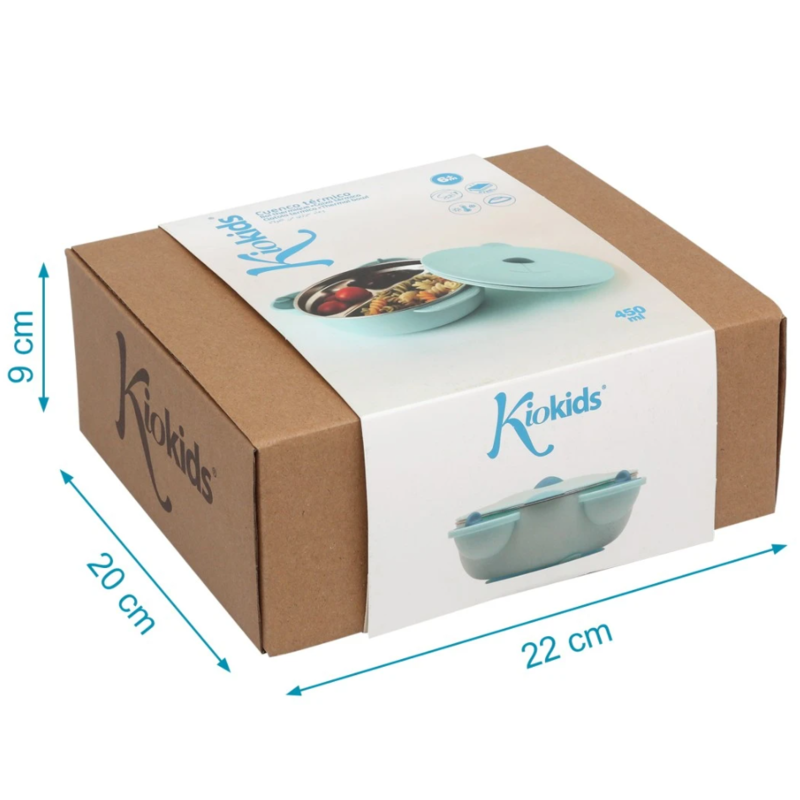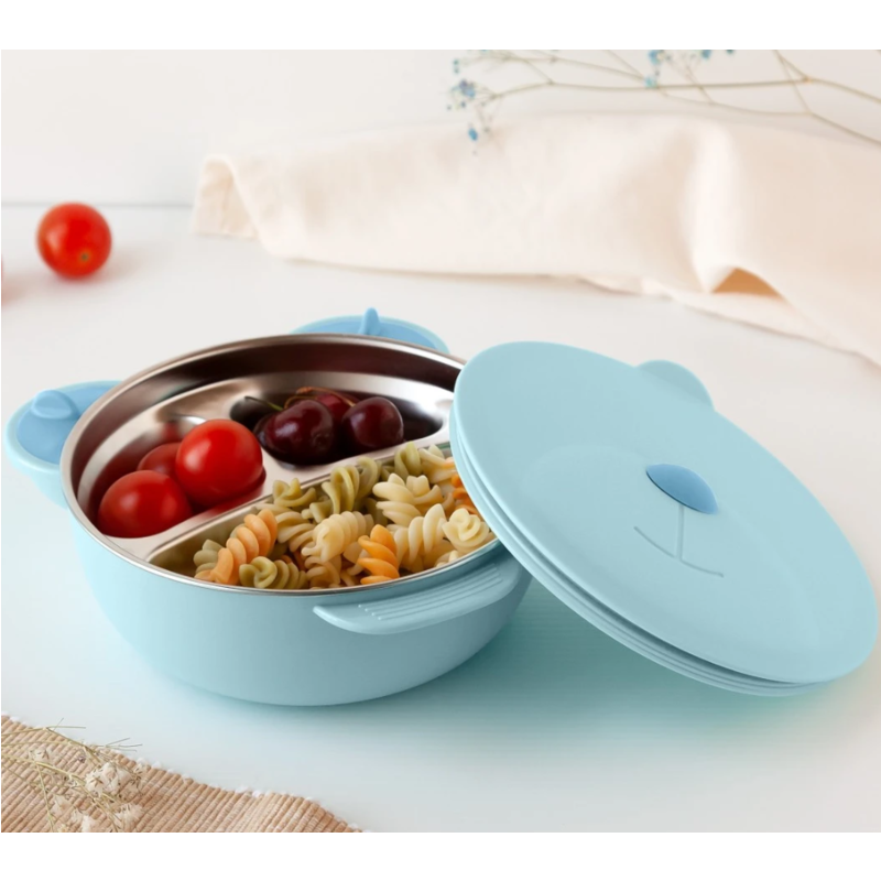El interior es en acero inoxidable, óptimo para el contacto con alimentos, y gracias a su ventosa anti-vuelcos, se mantiene fijo sobre una mesa o una trona, perfecto para los que empiezan a comer solitos.