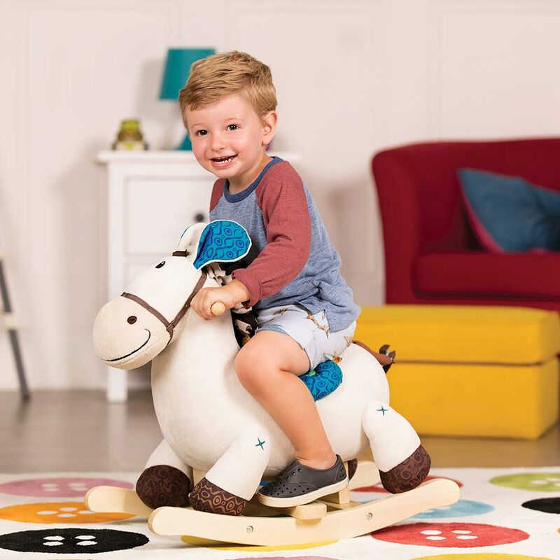 ¡Que empiece el rodeo! El nuevo caballo balancín de B Toys te va a encantar. Es un caballo muy blandito y muy cómodo para sentarte. La estructura de este caballo está hecha de madera resistente, así que no habrá peligro a que ceda. Tiene un diseño muy bonito y muy cuidado, típico de la marca B Toys. ¿Le pondrás nombre? Nosotros te proponemos el nombre de Banjo. Su tacto es muy suave, así que seguro que te gustará tenerlo cerca. Además, tiene sonido sin necesidad de pilas, así que te sentirás como un auténtico jinete cuando lo estés montando. ¡Yiiiihaaaa!