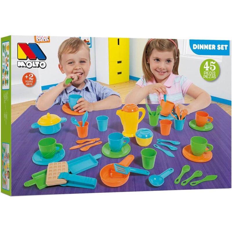 Set de Cocina de Juguete Molto de 45 piezas, ideal para complementar tu cocinita infantil y jugar con amigos siendo el mejor anfitrión en meriendas o cafés imaginarios. Gracias a este completo set, los peques podrán preparar comidas, servir, fregar y recoger tal como en una cocina real, aprendiendo mientras juegan.  Además, es un juguete educativo que estimula la imaginación, el lenguaje, las habilidades sociales y el desarrollo cognitivo desde temprana edad. ¡Diversión, aprendizaje y creatividad garantizadas!