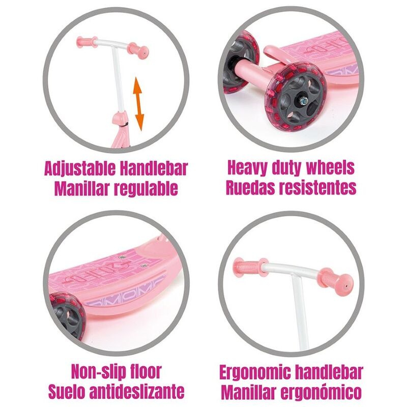 Patinete para niños y niñas de 3 ruedas, de color rosa, plataforma antideslizante.