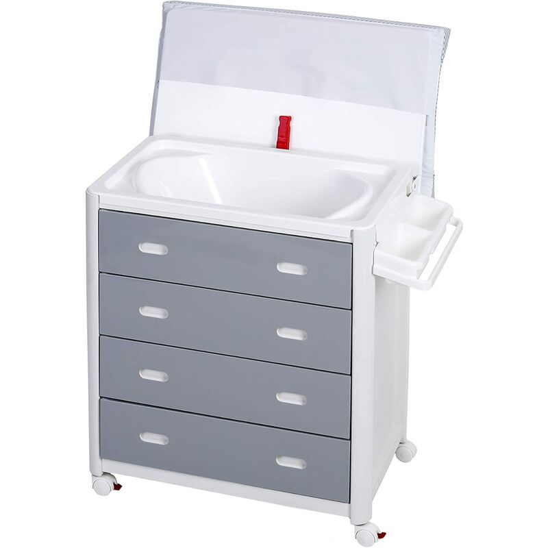 - Incorpora cambiador antivuelco, compartimentos para champús y esponjas. Tapón y tubo de desagüe. Ruedas para facilitar su transporte. Una vez el bebé crezca y no sean necesarios, el cambiador y la bañera se pueden quitar quedando una bonita cómoda.