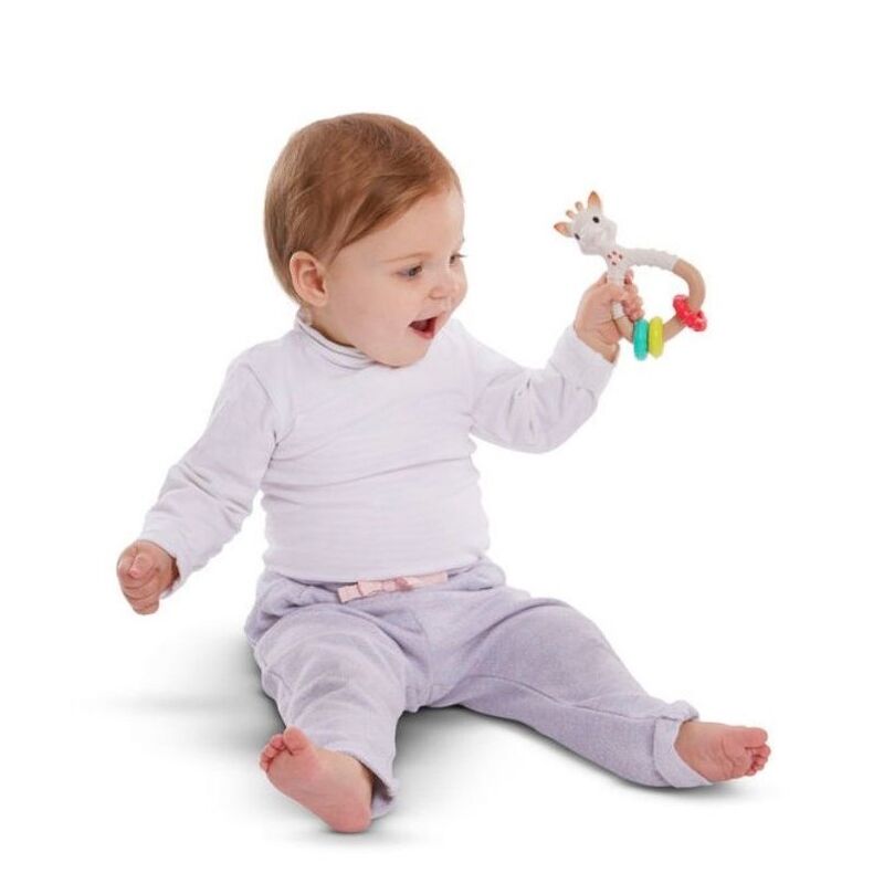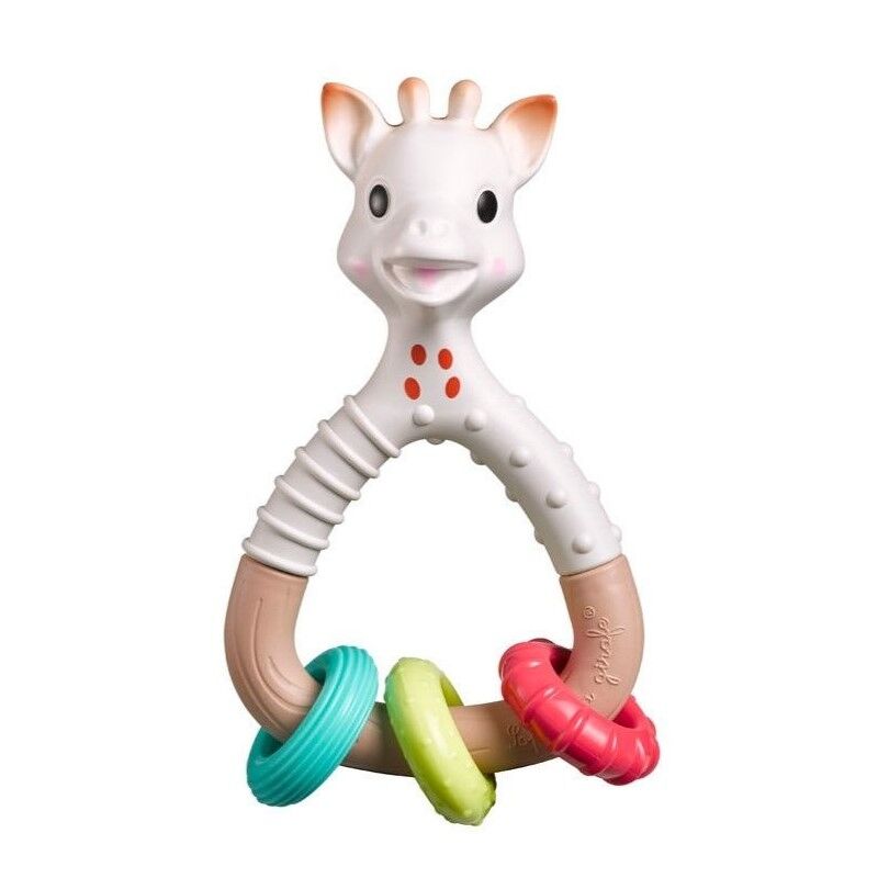 -El sonajero de la jirafa Sophie está formado por tres anillos de colores llamativos para atraer la atención del niño.