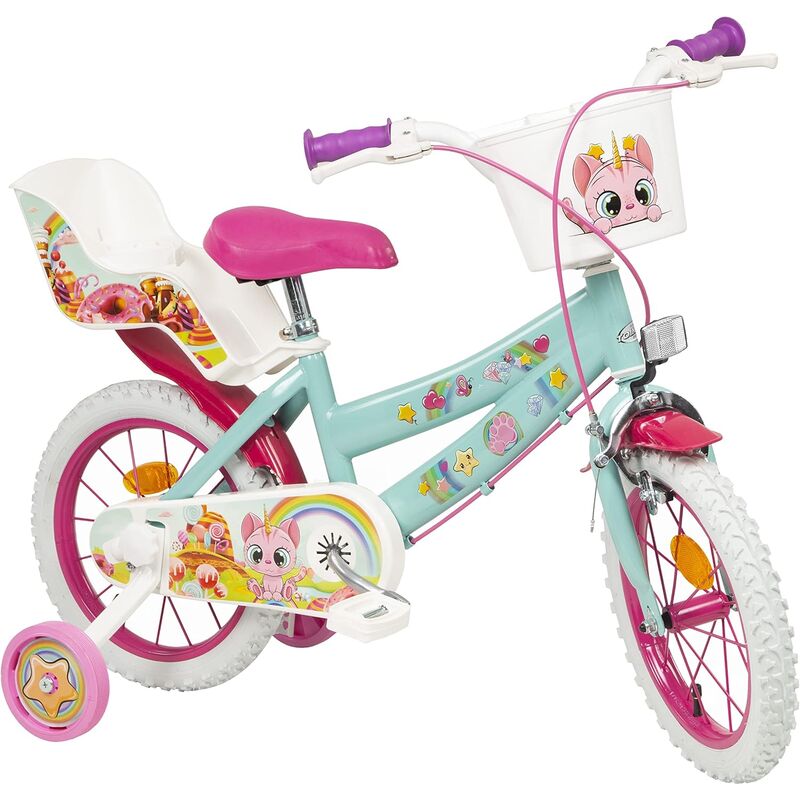 Toimsa bicicleta Gaticornio 14" con ruedas neumáticas les encantará. Tiene un diseño muy bonito. Además su sillín regulable es muy cómodo y se puede ir ajustando a medida que tu peque va creciendo. Como accesorios incluye una cestita delantera y un portamuñecas trasero. . Los ruedines le confieren la estabilidad que necesita para su primera bicicleta. ¡los guardabarros delantero y trasero harán que no se ensucie la ropa durante sus aventuras!